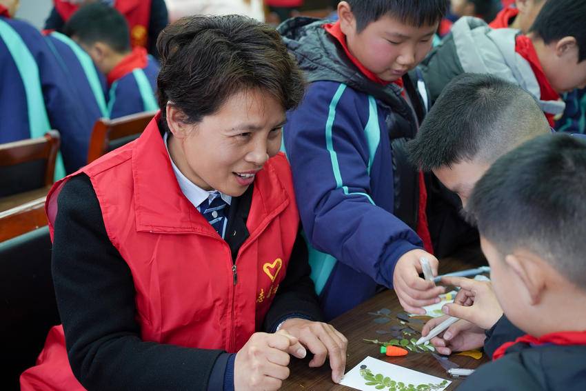 活动中,志愿者黄语琪和大家共同回顾了中华人民共和国农业部第一任副部长杨显东的故事。深切地感受着杨显东同志以祖国富强、民族振兴为己任,在中国农业发展、科技教育和社会事业方面取得的卓越成就,作出的杰出贡献。为了纪念杨显东先生,她们以《我心中祖国》为题,带领同学们打开思路,用春天的花朵、树叶进行了一次创意手工课。通过身边的“绿色”,启发同学们自选材料,即兴创作手工画。同学们8-10人为一组,凭借着天马行空想象和灵巧的小手,创作出了精彩手工作品,体味自然绿色的美丽和纯真的爱国情怀。