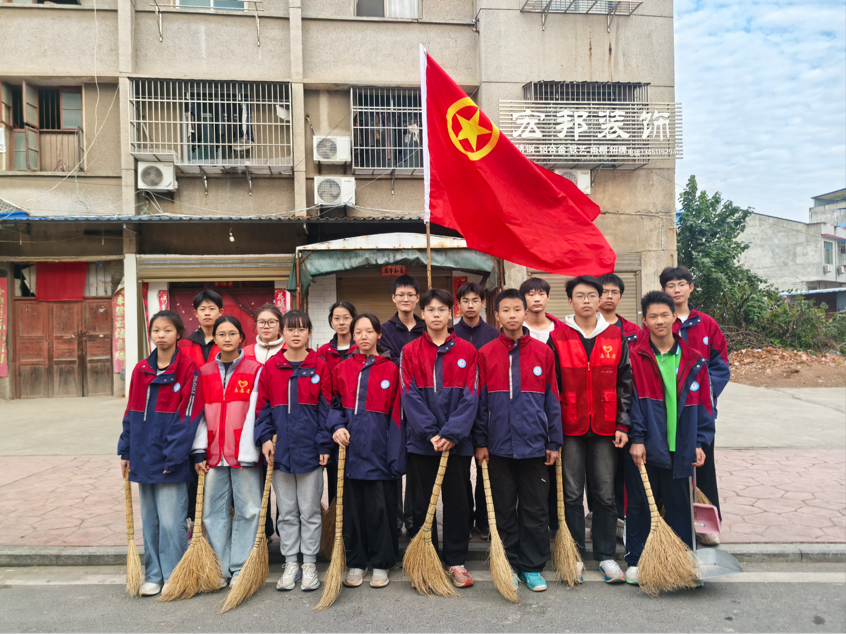 活动当日下午,新团员们在学校操场集合。校团委书记黄千作动员讲话,强调“安全第一,劳动第二”的原则,明确清扫任务与纪律要求;随后分发扫帚、手套等工具,全体成员合影后,高举团旗、校旗整齐列队前往学校周边主要街道。