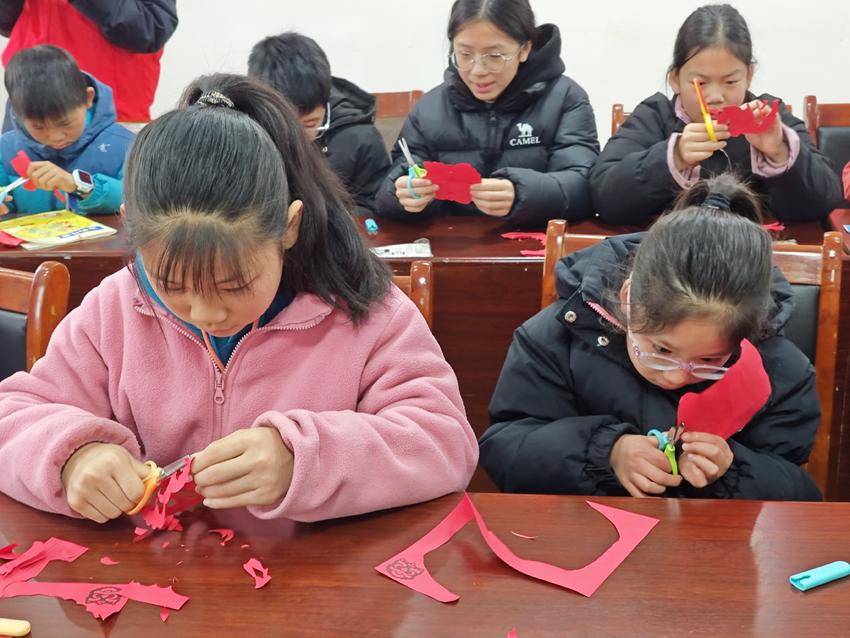 活动现场,在志愿者和指导老师的耐心讲解与示范下,孩子们兴致勃勃地投入到了剪纸、折纸等传统手工制作中。一双双小手小心翼翼地操纵着彩纸和剪刀,全神贯注地折叠、裁剪、勾勒。不一会儿,一幅幅充满童真与祝福的作品便跃然手中——红彤彤的“福”字寓意着福气临门、吉祥如意;造型生动的“春”字传递着对春天的期盼和新年的希冀;还有各式各样的窗花、小马等造型,都凝聚着他们对新春佳节的美好祝愿。
