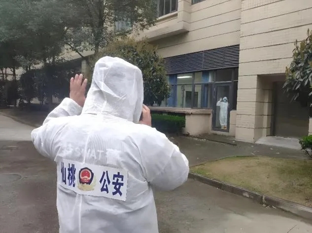 疫情防控期间,孙勤在仙桃市第一人民医院封闭执勤点督导勤务时,与妻子杜妲隔门相望,通过电话相互鼓励。