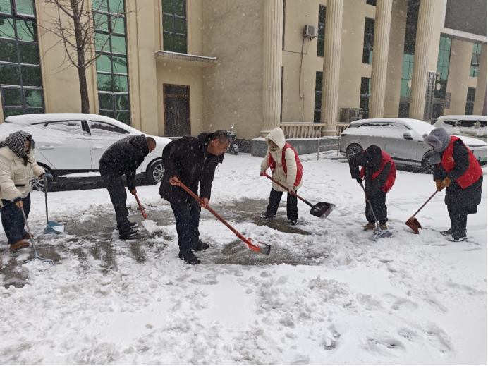 活动现场,在社区党总支书记胡元华的带领下,志愿者们身着醒目的红色马甲,手持铁锹、扫帚等工具,冒着纷纷扬扬的雪花,奔赴社区主次干道、商铺门前、居民小区出入口等重点区域。大家分工协作,配合默契,铲雪、扫雪、清运,干劲十足,处处可见志愿者们忙碌的身影。他们挥动工具的声响与相互鼓励的欢声笑语交织在一起,成为寒冷雪天中最动人的景象。经过数小时的奋力清扫,原本被积雪覆盖、湿滑难行的路面逐渐恢复了本来面貌,为居民和车辆的安全出行提供了有力保障。