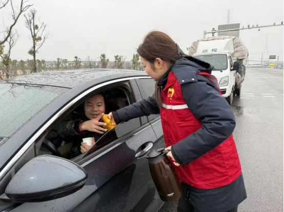 1月20日上午9时,在收费站外,工作人员将一杯杯刚熬好的姜丝可乐递到过往司乘手中。“一下高速就能喝上热饮,身上暖和,心里更暖!”从河南运送货物至湖北的货车司机张师傅接过姜茶时说道。