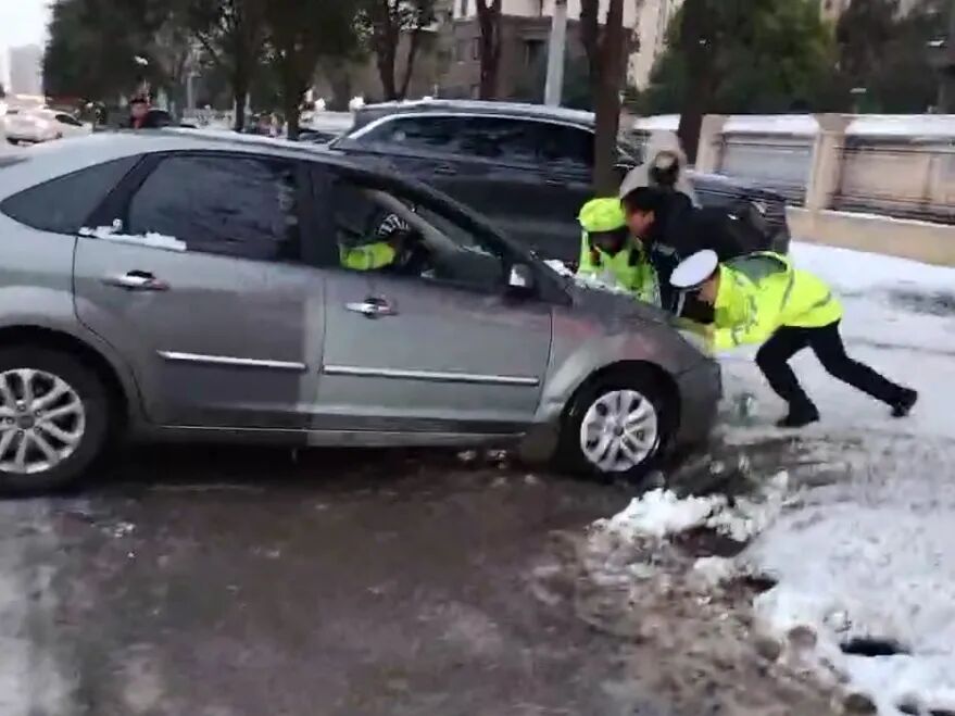 3名交警赶紧奔过去,发现女士的车就停在100米开外的路肩,因为风雪降温,车辆无法启动。交警们合力推动车辆,无济于事。此时一名交警换下女司机,打火倒车,另两名交警拼命推动车头,齐心协力之下,车辆终于倒出雪堆,正常上路行驶。