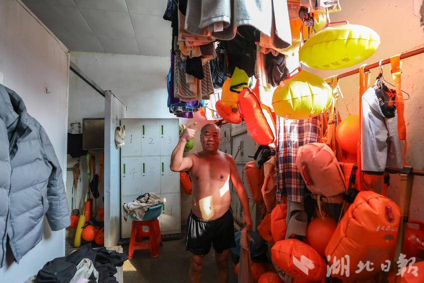 冬泳爱好者彭子清,60岁,游完泳后准备更衣。