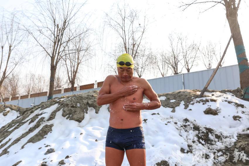 冬泳爱好者丁传中,58岁,下水前用雪搓身,让身体发热。
